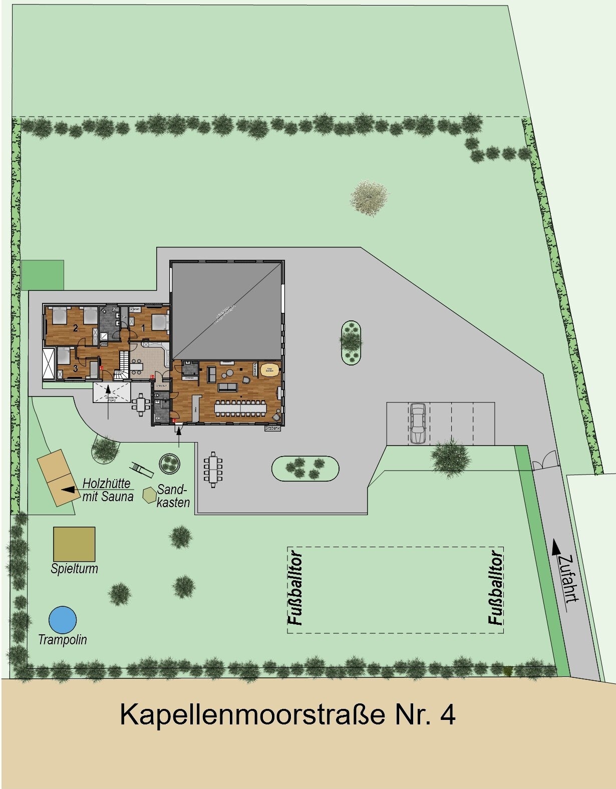 Draußen gibt es viel Platz zum Toben, Rennen und Spielen. Der Außenbereich bietet eine große Pflasterfläche zum Parken und einen Spielplatz mit Sandkasten, Schaukel, Rutsche und Trampolin. Für kleine Fußballfans stehen zwei Tore bereit.